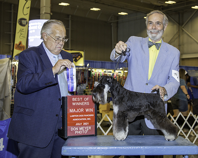 Beau winning a five point major by going BW at the Lawton Dog Fanciers Association show under Mr. Wade.