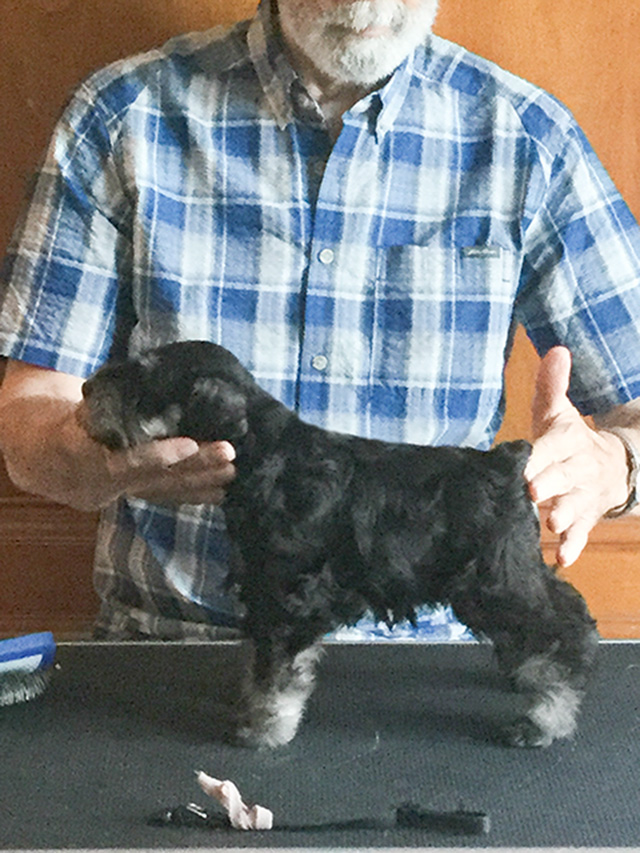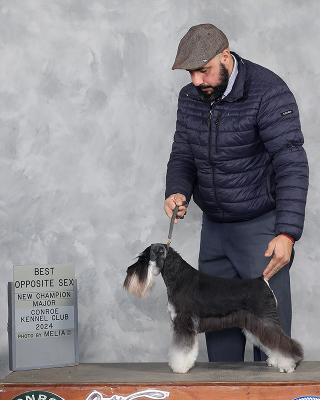 Demi shown with Chuy winning her second point major by going WB and BOS at Houston All Terrier Club show under Ms. Pam Wilson.