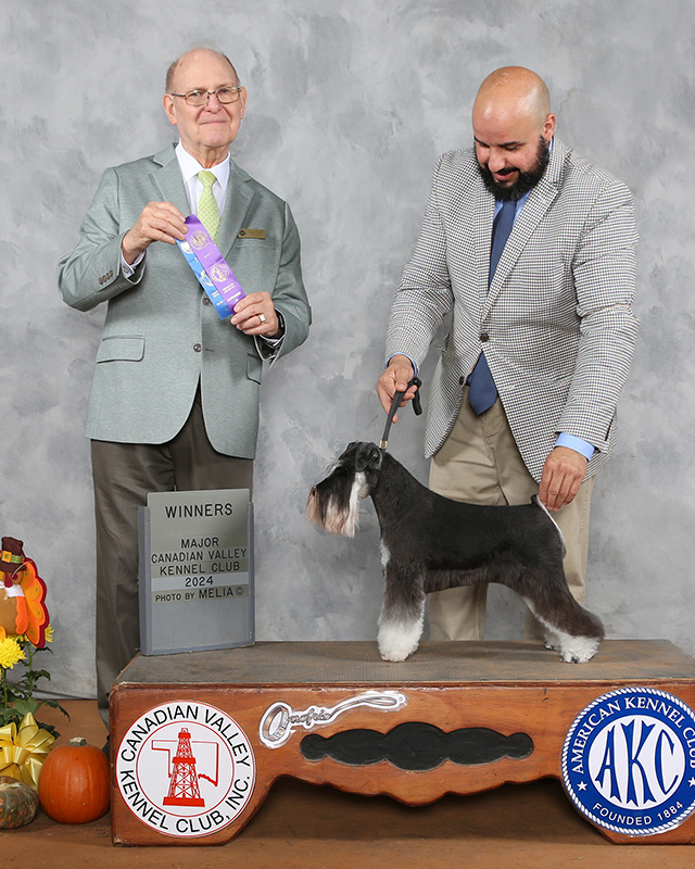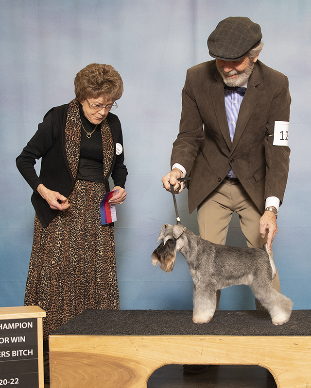 Our first black and silvers in more than twelve years, littermates EB (GCH Gangway's Mission Jackpot) and Jett (GCH Gangway's Mission Jetpack) were ranked 2 and 3 among all black and silver Miniature Schnauzers for 2018 by the Schnauzer Shorts system. They accomplished this with neither being specialled more than a handful of weekends. They are both pictured winning five-point majors their first weekend in the ring under Ms. Paulk. They are co-bred, co-owned, and shown by Mary Jo Larsen and Bill Brown.