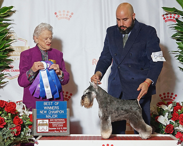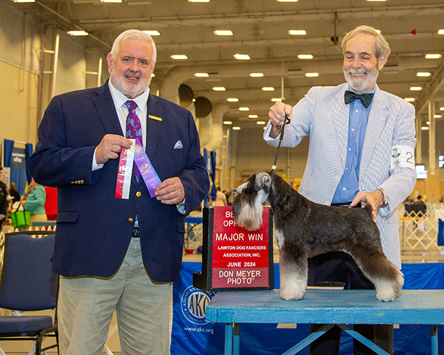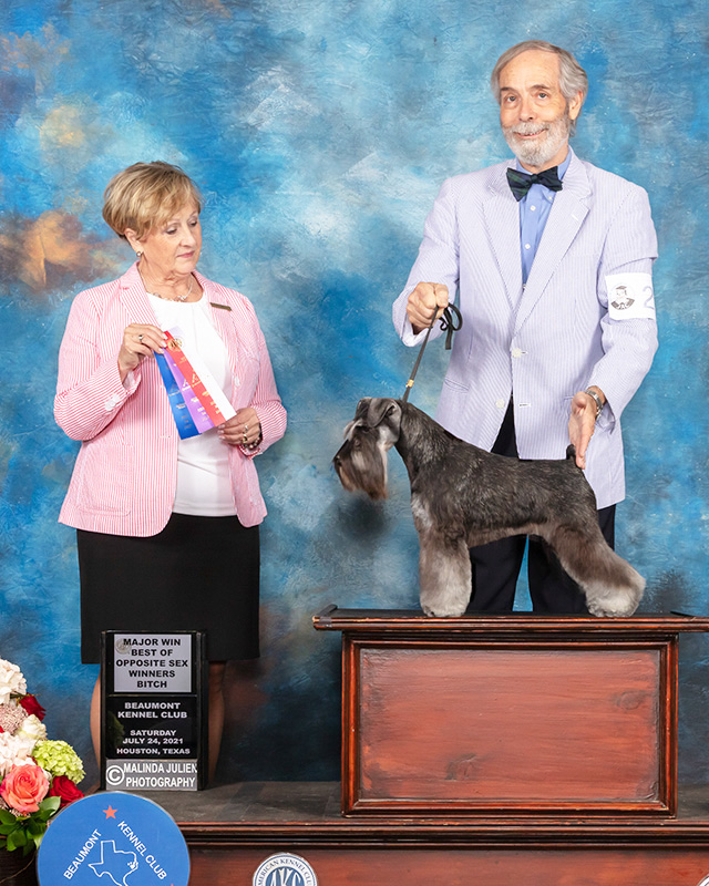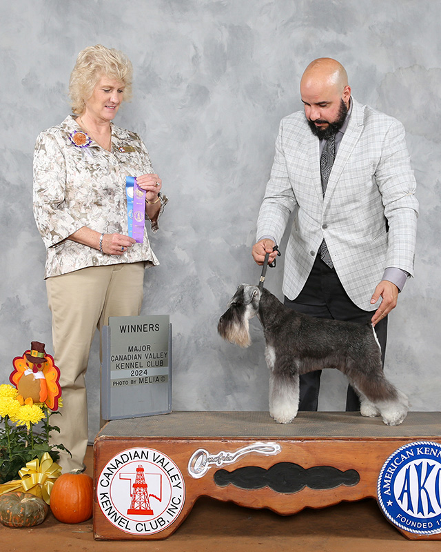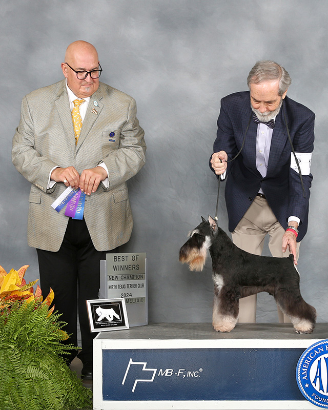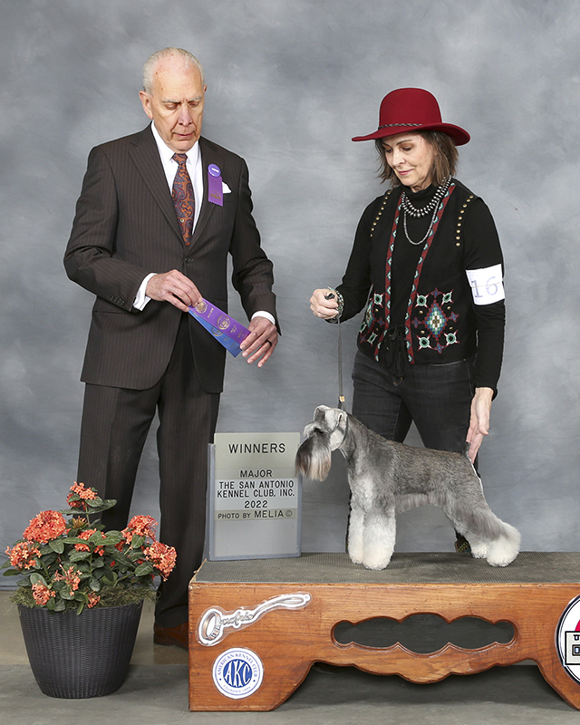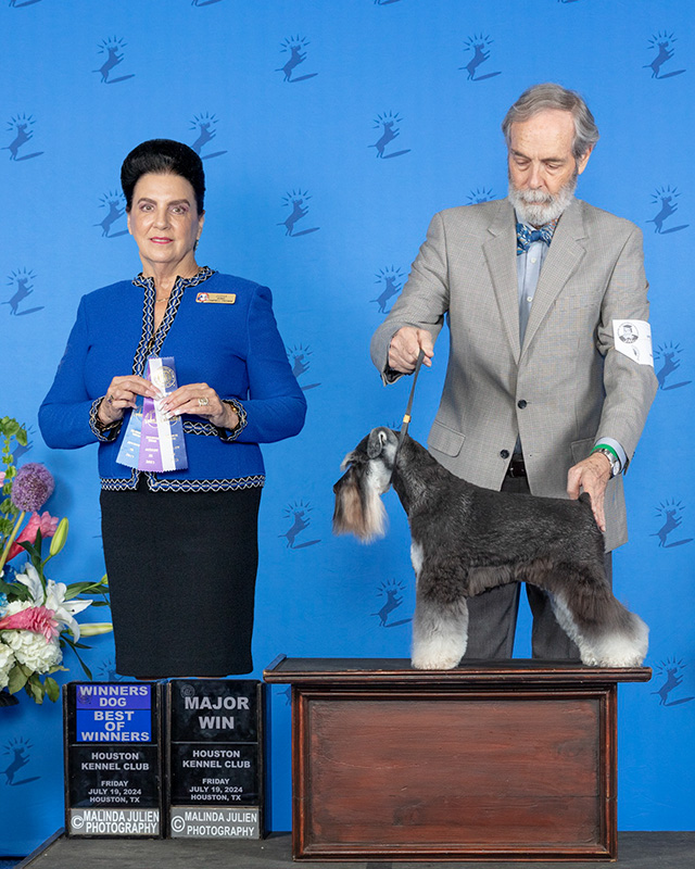 Champion Gangway's Mission Impact Again Top Producer! Coco was recognized by the AMSC as the top producing bitch in 2024 with four champions from her first litter. Another finished in 2025 to complete her second five champion litter, which is unprecedented in the history of the breed! She also became the top living producer in the breed. She continues a long line of top producing Gangway bitches starting with CH Ruedesheim's Gangway Annie (9), CH Gangway's Final Feature (12), CH Gangway's Jacqueminot Jumpstart (10), and CH Gangway's Mission Descent (4). New Champion Gangway's Mission Q.E.D.! Demi is shown winning a four point major by going WB at the Canadian Valley Kennel Club show under breeder-judge Steve Hayden. She finished with three majors, shown on all three occasions by Chuy Moreno. She is the tenth champion for her dam CH Gangway's Mission Impact and the seventeenth for her sire GCH Wards Creek's Cool Cat. She is our eleventh black and silver and eighteenth natural-earred champion. She is the sixty-first champion for Gangway and the thirty-fourth for Mission. She is owned by Miguel Orozco and bred by Mary Jo Larsen and Bill Brown. New Champion Gangway's Mission Propulsion! Push is shown winning WD and BW for five point major at the AKC Championship show in Orlando under respected judge Lydia Hutchinson. This is the biggest show of the year in the United States. He finished with three five point majors in December, including a BB over top-winning specials. He was shown on these occasions by Chuy Moreno. As a precursor to these exciting wins he was twice Best Beginner Puppy in Show. He is the first champion for his dam CH Gangway's Mission Keepsake and the sixth for her sire CH Wards Creek's Spring Rendezvous. He is owned by Sarai Silva and is bred and co-owned by Mary Jo Larsen and Bill Brown. New Champion Gangway's Mission Quintessential! Essie is shown winning a four point major by going WB at the Canadian Valley Kennel Club show under Ms. Graser. She was shown on this occasion by Chuy Moreno. This stunning bitch finished with five majors including two other four point majors at the Houston summer shows. She is the ninth champion for her dam CH Gangway's Mission Impact and the sixteenth for her sire GCH Wards Creek's Cool Cat. She is our seventeenth natural-earred champion. She is bred and shown by Mary Jo Larsen and Bill Brown. New Champion Gangway's Mission Quiddity! Ditty is shown winning a four point major by going WB and BOS at Lawton Dog Fanciers Association show under breeder-judge David Kirkland. Despite taking a back seat to her sisters, she finished handily on one coat from the 12-18 class with three majors, including a second four pointer at the Houston summer shows. She is the eighth champion for her dam CH Gangway's Mission Impact and the fifteenth for her sire GCH Wards Creek's Cool Cat. She is our sixteenth natural-earred champion. She is owned by Francis Green and bred and shown by Mary Jo Larsen and Bill Brown. New Champion Gangway's Mission Quipster! Roscoe is shown winning his second four point major by going BW at the second Houston Kennel Club summer show under Mrs. Campbell-Freeman. He finished the next weekend by winning BW for his third major at the Longview Kennel Club show. He is the seventh champion for his dam CH Gangway's Mission Impact and the fourteenth for his sire GCH Wards Creek's Cool Cat. He is our fifteenth natural-earred champion. He is owned by Kristi Post and bred and shown by Mary Jo Larsen and Bill Brown. New Champion Gangway's Mission Quantifier! Fire is shown finishing his championship by winning BW at the Lone Star Miniature Schnauzer Club specialty. He completed his title in 8 shows with two 5 point majors, both under breeder judges, including a BB over top specials. He is the sixth champion for his dam CH Gangway's Mission Impact and the ?? for his sire GCH Wards Creek's Cool Cat. He is our tenth black and silver champion. He is bred, owned and shown by Mary Jo Larsen and Bill Brown. New Champion Gangway's Mission Negotiator! Birdie finished her championship in style by going BB at the Austin Kennel Club show in September, from the bred-by class over multiple top-winning specials and then onto G2 over mutiple BIS-winning terriers, under noted judge Robert Hutton. She started late but finished with 5 majors with three from the 12-18 class her first weekend out. She is pictured winning her third major her first weekend out, also under Mr Hutton. She completes our ninth all-champion litter and is the fourth champion for her dam GCH Gangway's Mission Descent and the sixth for her sire GCHS Repitition's Hard Knock Life. She is our 55th champion of the modern era. She is bred, owned and shown by Mary Jo Larsen and Bill Brown. New Champion Gangway's Mission Keepsake! After a long layoff due to Covid, Ava is pictured winning her second major to finish by going BOS at the Brazos Valley Kennel Club show in March under judge Pat Trotter. She completes our eighth all-champion litter and is the second champion for her sire GCH Gangway Murphy's Lawyer and the fifth for her dam GCH Gangway's Mission Countdown.. She is bred, owned and shown by Mary Jo Larsen and Bill Brown. New Champion Gangway's Mission Magic! Emma is pictured winning her first major by going BOS over specials from the puppy class for a five-point win at the Beaumont Kennel Club show in July 2021 under judge Peggy Beisel-McIlwane. She finished at the Brazos Valley Kennel Club show in March 2022 under Judge Denny Mounce. This stunning bitch is the fifth in her litter to finish and all natural-earred. She is the fifth champion for her dam CH Gangway's Mission Impact and the tenth for her sire CH Repitition's Tour de Force. She is owned by Terry Hamer and bred and co-owned by Mary Jo Larsen and Bill Brown. She was handled to her championship by Brown and Larsen. Champion Gangway's Mission Impact Top Producer! Coco was recognized by the AMSC as the top producing bitch in 2021 with f