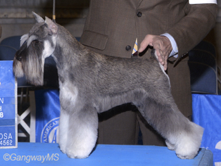 Digger finished on one coat from the puppy classes with four majors. He opened with back-to-back majors his first weekend at the Ft. Worth shows. He is the second champion for his dam Ch. Gangway's Running Ahead and the second for his sire Ch. Gangway's Mission Commander. He is Gangway's 37th champion. He is owned and loved by Kay Medofrd. He was bred, co-owned and shown by Bill Brown and Mary Jo Larsen. He is