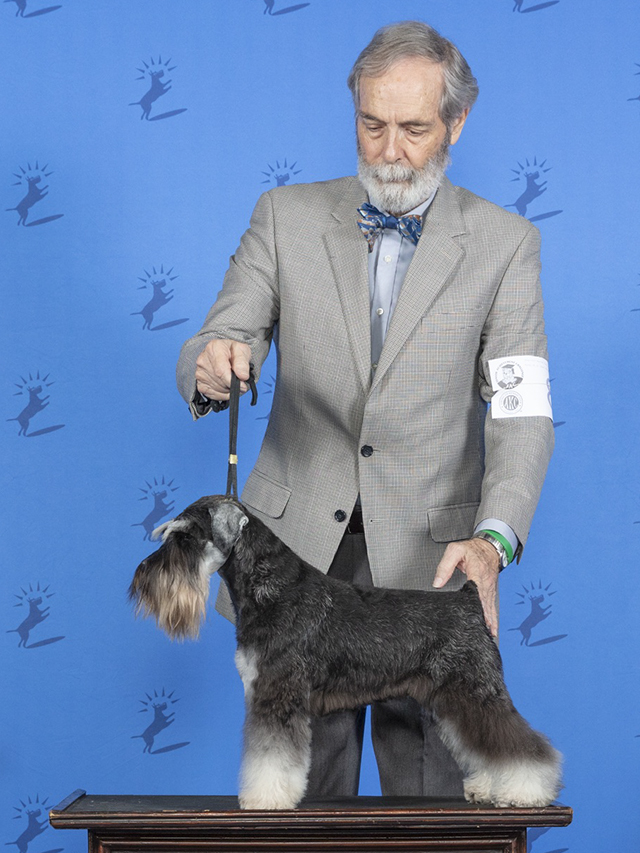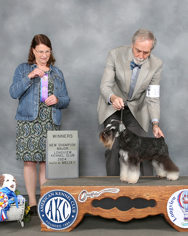 A puzzled Ditty winning her third major and finishing her championship by going WB and BOS at the final Longvier Kennel Club show under Ms. Felton. Yes Ditty, you really are a champion!