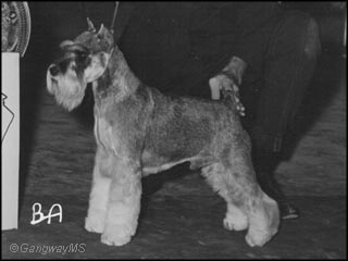 PB finished his championship with multiple breed wins and two G1's. He was a multiple group and specialty winner and was among the top-winning Miniature Schnauzers in 1964. He was the sire of champions but his line survives into most of today's blacks and many salt & peppers through his daughter Kansho's Dinah.