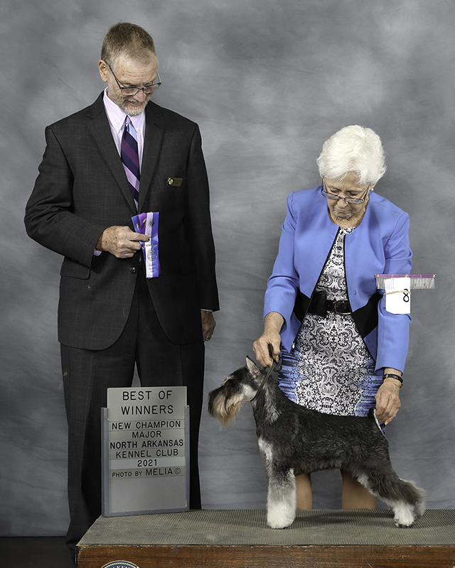 Roxie completing her championship by going BW at the North Arkansas Kennel Club show under Mr. Warnall