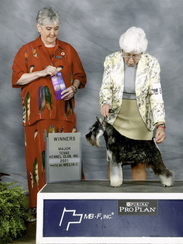 Roxie winning her first major at the Texas Kennel Club show under Mrs. Brown.