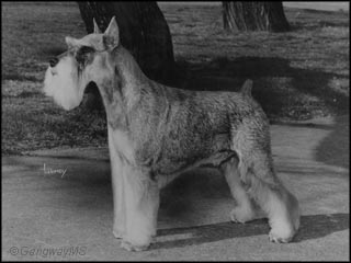 Zeus finished with four majors. He was a multiple group winner and was among the top-rated Miniature Schnauzers in 1966. He was the sire of Ch. Kansho Go-Go's Cupid and the full brother of Kansho Peggy's Jacko whose bloodlines persist in some of today's top showdogs.